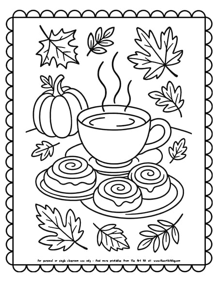 Fall-tea-party-with-pumpkin-spice-tea-cinnamon-rolls-and-leaves-coloring-page copy